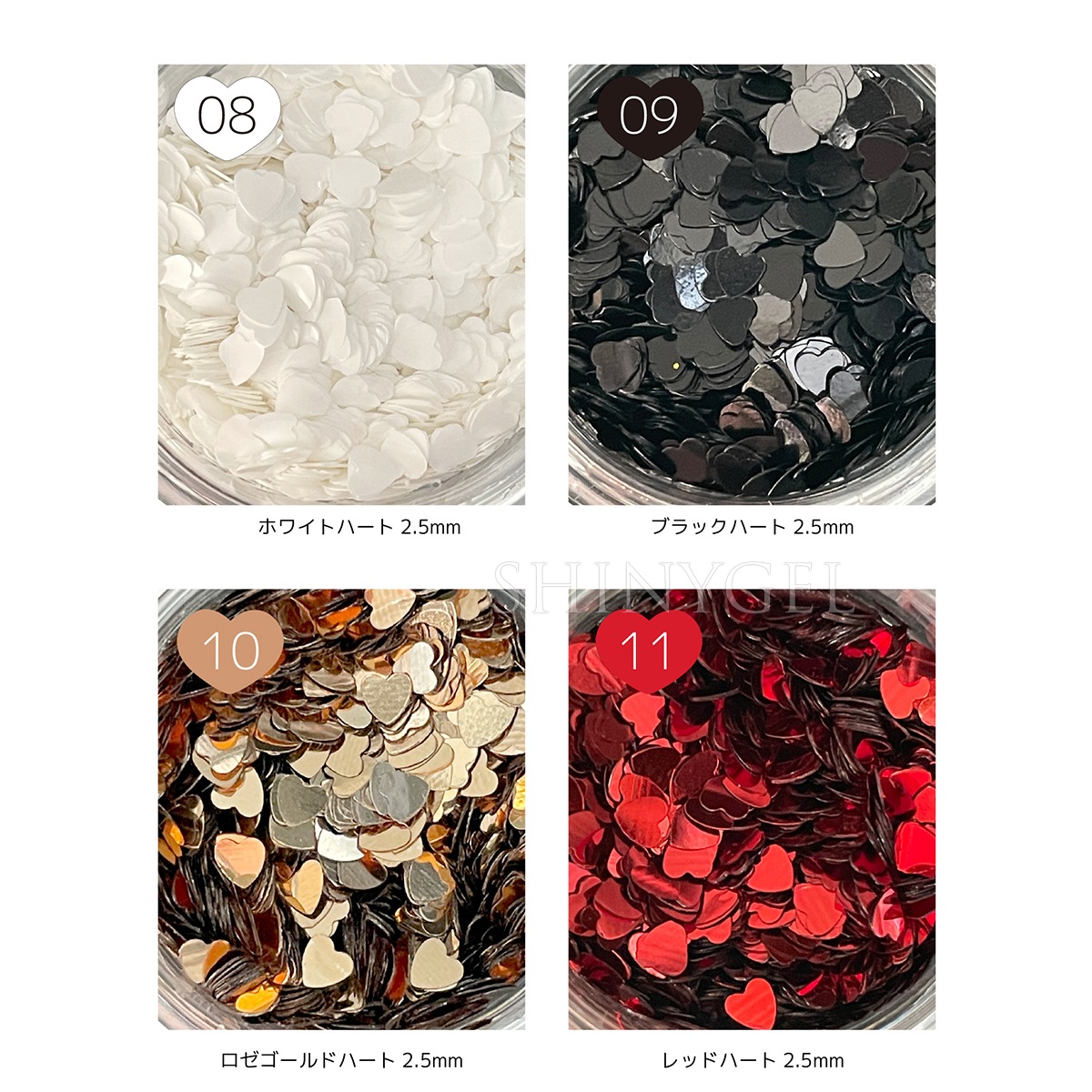 | 商品説明 | バレンタインネイル等におすすめのハートホログラムです。 ●カラー:ブラック/ロゼゴールド/レッド/ゴールド ●サイズ: 2.5mm(ホワイト/ブラック/ロゼゴールド/レッド) 1mm(ブラック/レッド/ゴールド) ●内容量:各約1g ----------- 別途ピンクのハートもお取り扱いがございます。 ・erikonail:ピンクハート(ERI-122) |