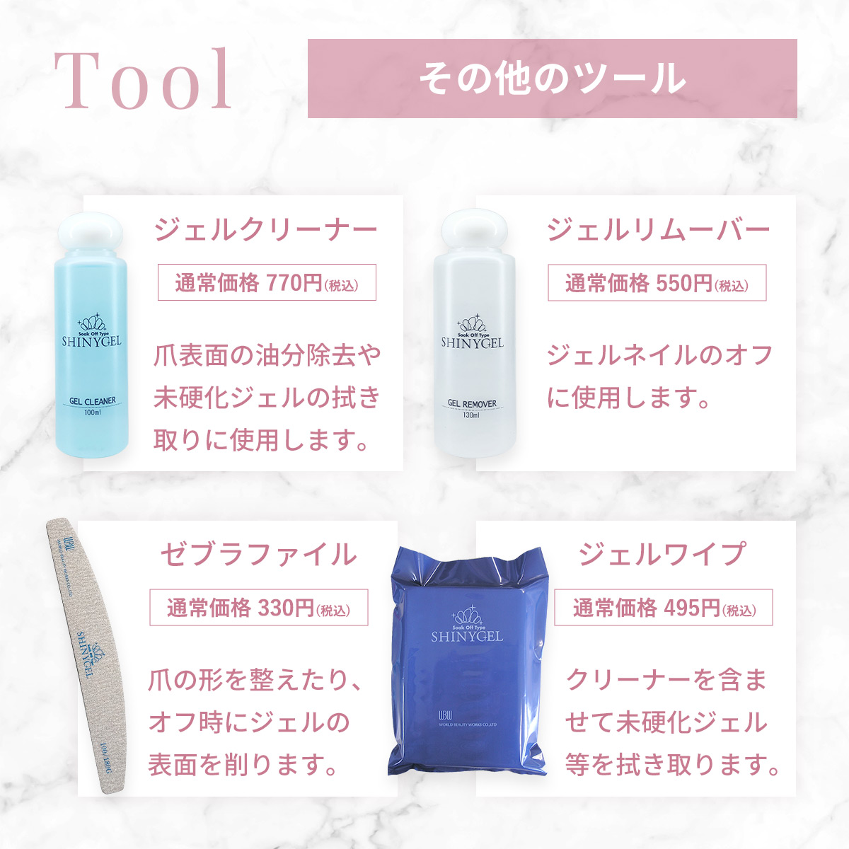 ※ランプの反射板に付いている保護シートは剥がしてからご使用ください。 ※欠品中のカラーをご選択いただいた場合、欠品商品が入荷次第の発送となります。別便でお届けすることはできませんので、ご了承ください。 ★SHINYGEL 6W 【ボトル】ジェルネイルキット★ オフが簡単・爪が痛まないSHINYGELジェルネイルキットは、初めての方でも簡単にできるお得なジェルネイルセットです。初めての方でも迷うことなくまるでネイルサロンに行ったようなうるうるツヤツヤなネイルを完成させることができます。 こちらのキットはベース、トップ、カラージェルがすべてボトルタイプなので、ポリッシュ感覚で使用することができ、セルフネイルをもっと気軽に、便利に楽しむことができます。 また、シャイニージェル製品は、爪の健康をきちんと考えられた製品なので爪が傷む心配もありません。 特に自爪と一番近い部分に装着するベースジェルにはこだわっており、ジェルネイル後の爪への負担を最小限に抑えることに成功しました。 「ぺろんと簡単にオフができる」「ジェルネイルをしているのに爪が傷まない」「オフ後なのに爪がしっとりしている」等、ご自身の自爪の健康を守りながら美しいネイルを楽しむことができます。 製品作りには強いこだわりがあり、ジェルネイルは日本製の原料・製造・充填におけるまですべて日本国内の工場で行っております。 もちろん製品一つ一つに化学理論に基づいた根拠がある確かな製品なので、安心してご使用いただけます。 こちらのキットに入っているLEDランプは、初めての方でも扱いやすい「6WポータブルハイブリッドLEDランプ」となります。 ハンディサイズでコンパクト、さらに充電式で持ち運びに便利!UVとLEDが同時に放出されるハイブリッドLEDランプです。 ぜひシャイニージェルのこだわりの製品で楽しいジェルネイルライフをお楽しみください! |