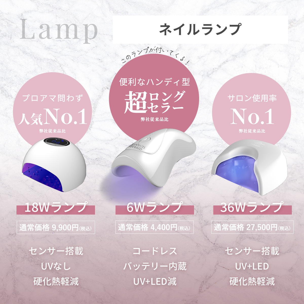 | ご注意 | ●30分以上の連続使用はお止めください。 ●LED部分を直接触れたり、溶剤などで拭かないでください。故障の原因となります。 ●目を傷める恐れがありますので、ご使用中はLEDライトを直接見ないでください。 ●海外でのご使用は保証しておりません。また、海外でご使用された際の故障や不具合につきましては、保証対象外となりますので予めご了承ください。 ●ジェル・ランプ以外が他メーカー製品に変更になる場合がございます。 ●セットに含まれるアセトンは揮発性が高く引火性液体となりますので、火気および取り扱いには十分注意をしてください。 ※ジェルの硬化時には必ず硬化熱が発生します。爪が薄い方、傷んでいる方や、塗布量が多い場合は特に熱く感じやすいためご注意ください。痛みを感じるほど熱いときは、一度ランプから手を離し、熱さがやわらいでから再度硬化してください。